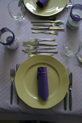 même service , celui de ma maman. Une nappe en papier blanche ("ça va avec tout") et des serviettes mauves pliées à la "va-comme-je-te-pousse" et maintenues par un lien en raphia parme crocheté en chaînette.